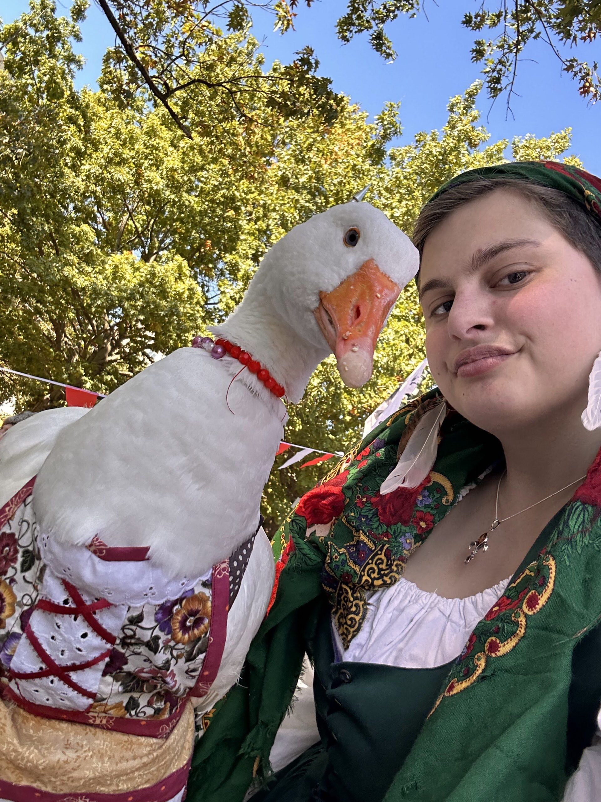 However, I wanted to keep Zuzu friendly. Geese are not fun to deal with when they get territorial or hormonal. So, I ordered her goose diapers, found the outfits, and started to take her to my local pet stores. Sure enough, she found her calling. Zuzu became OBSESSED with the attention she got from her peers. Soon enough we were invited to local festivals, parades, and fairs. Though that’s not where her journey ends.